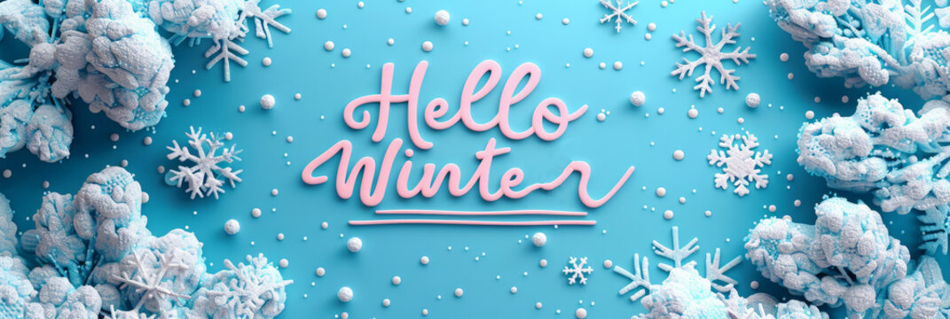 "Hello Winter" written in frosty lettering on a bright blue background, surrounded by snowflakes and snowy branches for a festive seasonal vibe.
