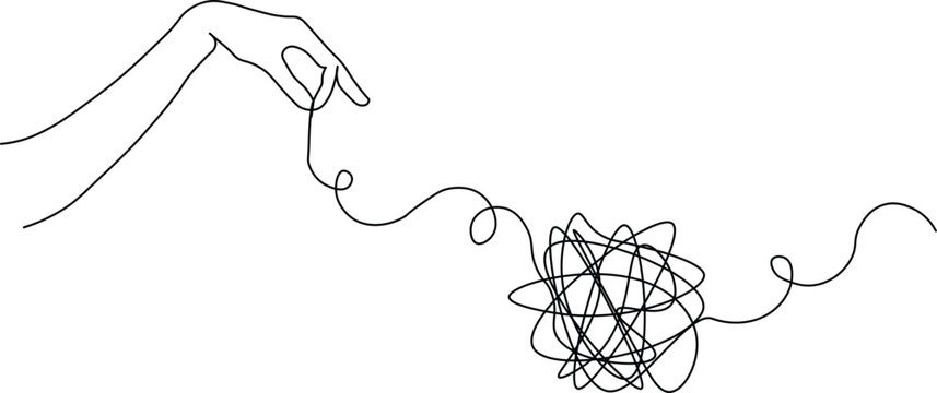 Unraveling complexity with a single thread, hand delicately navigating chaos, symbolizing clarity, problem-solving, and hope in a world of uncertainty and mental health awareness