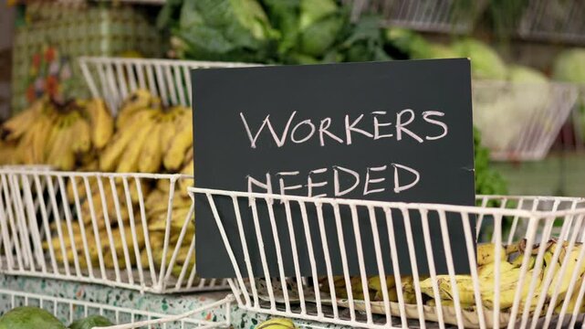 Job opportunity, workers needed sign at grocery shop where fresh healthy fruits and vegetables produce are sold.