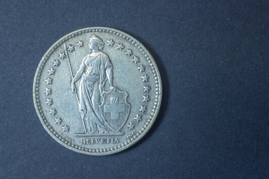 1 Swiss Franc coin closeup. Blue tinted background or wallpaper about economy, business or swissy. Money and Central Bank in Switzerland. Blurred figure of Helvetia, focus on cross. Macro