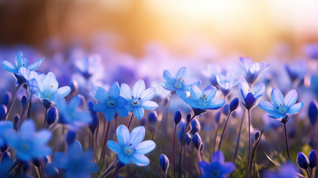 Peaceful scene of blue hepatica flowers flourishing in the golden light of a setting sun, symbolizing tranquility.
