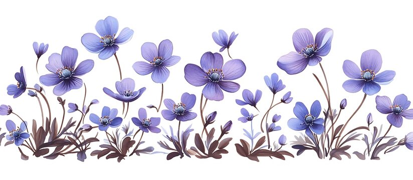 First spring flowers, Anemone hepatica isolated on white background. Border of blue violet wild forest flowers liverwort