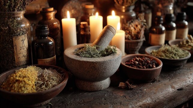 Wicca Herbs. Kitchen Witchery with Mortar and Pestle. Herbalist Ingredients for Wiccan Altar.