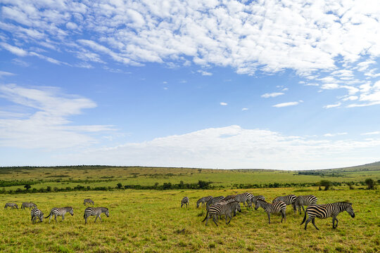 Landscape of the African savanna with beautiful blue skies and zebra herds (Masai Mara National Reserve, Kenya)