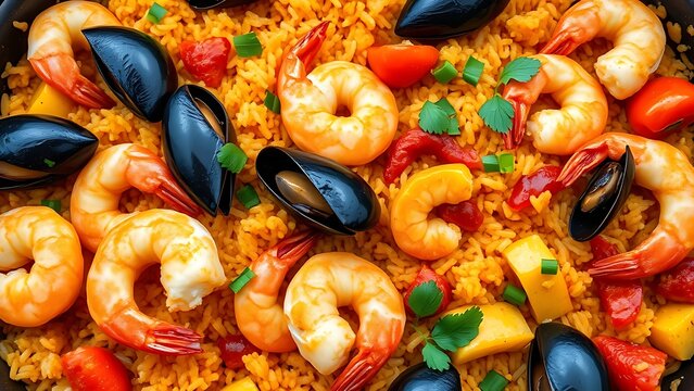 heretic. Spanish seafood paella with shrimp, mussels, and peppers on a plate. inspires cooking, menu design, designed for food delivery and cloud-kitchen brand materials, used by data scientists.