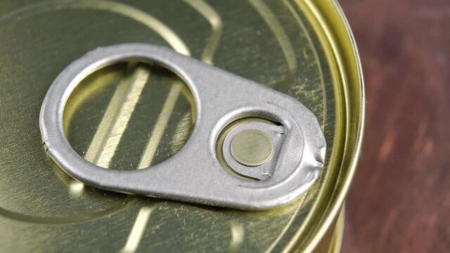 Conserved food aluminium can with pull ring on a wooden background. Unopened hermetic container. Macro. Slow rotation