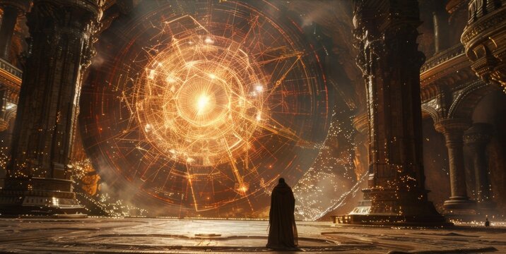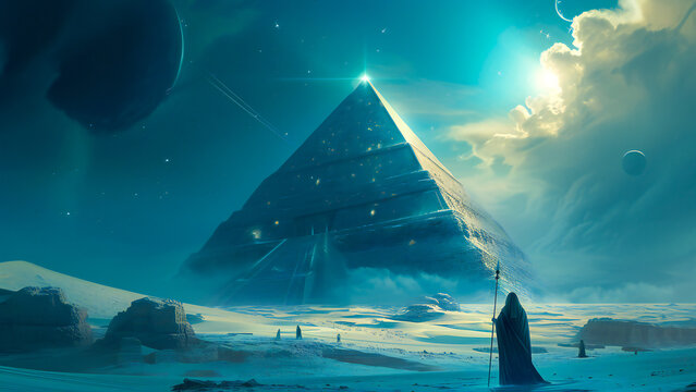 A pyramid of wisdom, surrounded by planets. Eternal temple of wisdom, esoteric, hermetic and cabal fantasy concept.