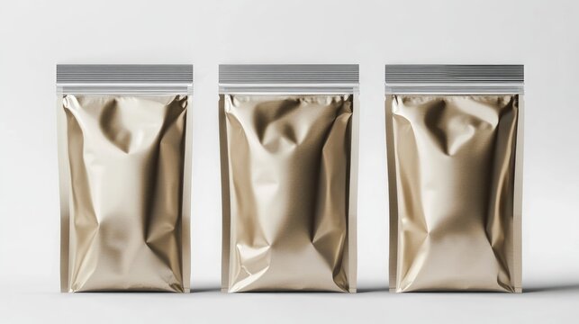 Aluminum coffee bags with hermetic Ziplock closure featuring Kraft paper and foil design ideal for coffee bean packaging mockup and advertising template background for product display