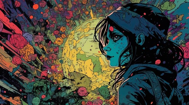 Detailed comic-book art of a young woman with a contemplative look on her face, AI-generated