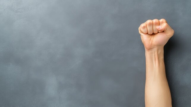 Strong raised fist hand gesture against a textured gray background symbolizing power and determination