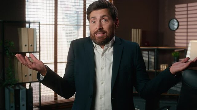Portrait at office confused puzzled Caucasian man business male employer company CEO businessman guy looking at camera spread hands shrug shoulder unsure dont know hesitate shrugging hesitation