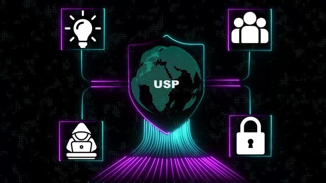 Glowing neon USP of Technology and Digital Security Future Growth, Expansion and Smart Innovation Cyber Protection, Online Safety and Modern Advantage. hi tech motion graphic animation and  background
