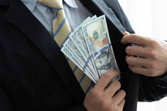 Business man holding dollar cash in hand hiding money in suit. Concept for corruption, finance profit, bail, crime, bribing, fraud.
