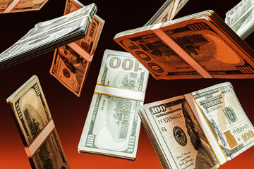 Money stack. Hundred dollars of America. Falling money isolated, us bill background.