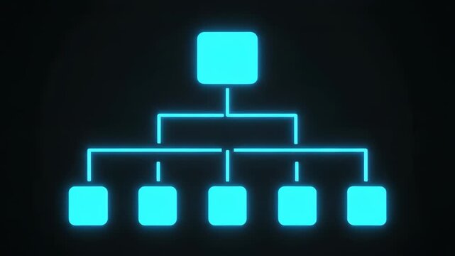 Hierarchical organization chart glowing blue neon digital structure with connected nodes and branches showcasing modern technology network and seamless connection in futuristic hierarchy design