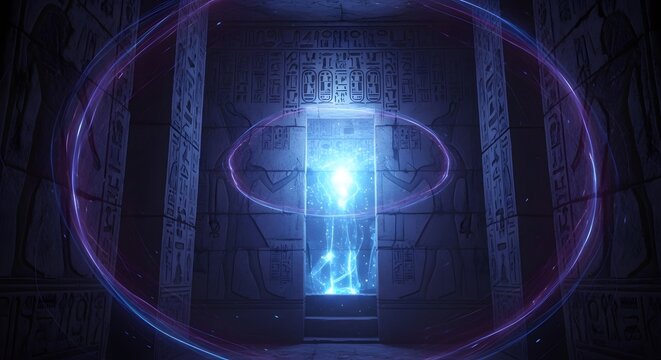 Ancient Egyptian Portal: Mystical Blue Energy Emanating from Hieroglyphic Chamber