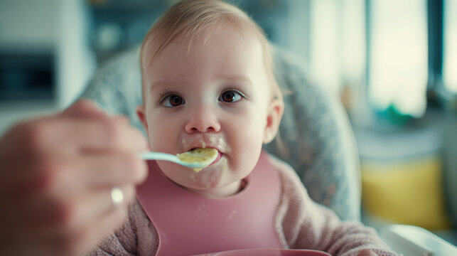 First-person view of feeding toddler with spoon in high chair