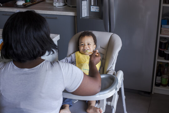 Mother looking at baby boy eating solid food on high chair at home
