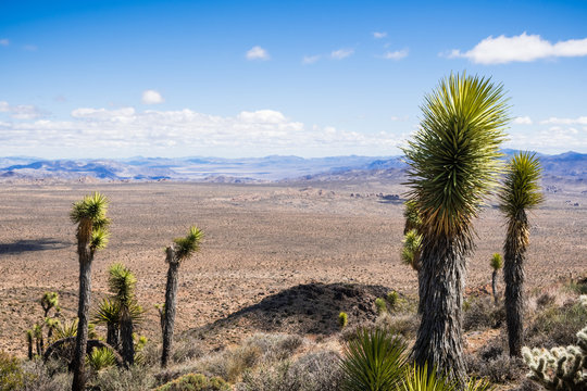 Young Joshua Tree (Yucca Brevifolia); growing at high altitude; wide valley in the background; Joshua Tree National Park, south California