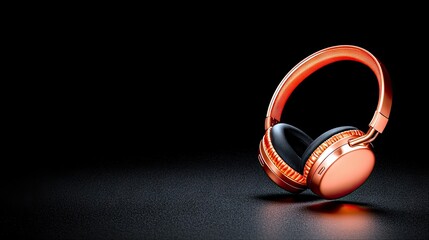 Overhead view of black over ear headphones resting on a smooth gray surface. This audio device is ready for listening music, podcasts or gaming. It is a modern gadget for sound.