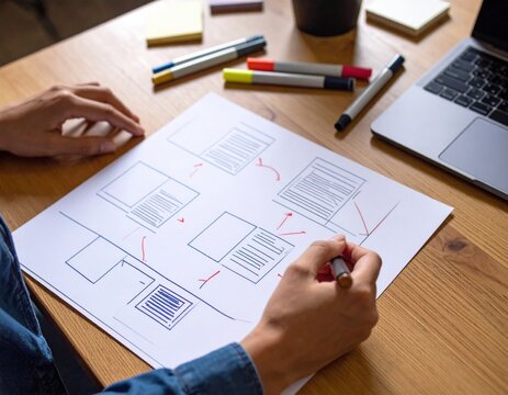 UX designer sketching mobile app wireframe flow with paper layout, pen, laptop, markers and sticky notes creating focused creative planning mood