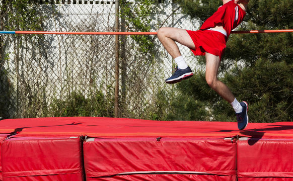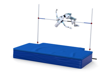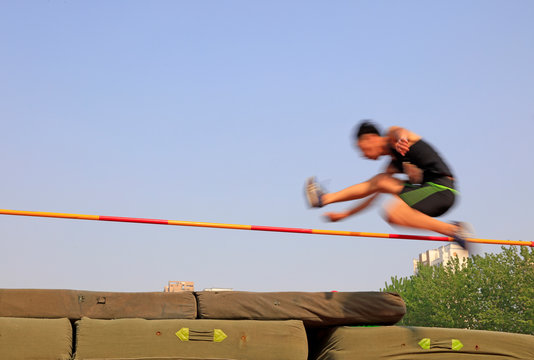 A male athlete runs and jumps high over the crossbar. Slow-motion shooting of the high jump competition. Professional Olympic sports