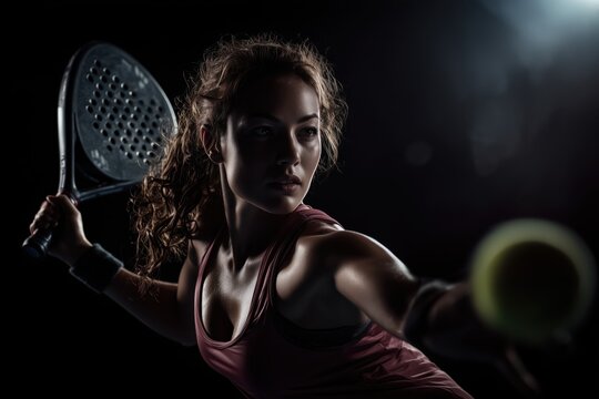 a beautiful woman playing padel, in a dynamic pose with a racket and ball, isolated on a dark background