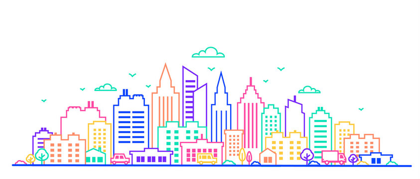City landscape. Thin line City landscape in neon glow vivid colors.. Downtown landscape with high skyscrapers. Panorama architecture Goverment buildings Isolated outline illustration. Urban life