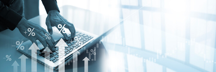 Interest rate increase concept. Businessman show  percentage and up arrow investment, Interest rate increase, business hike growth, stocks, mutual fund, high exchange rate. Long term investment