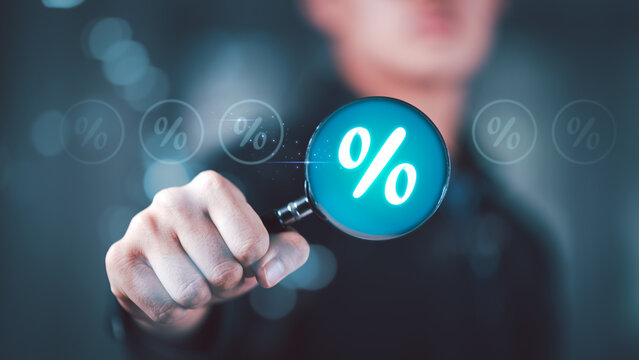 Interest rate and high return concept, business growth increase interest, money, fund, cost and capital, return on stocks and mutual funds, long term investment for retirement percentage symbol arrow.