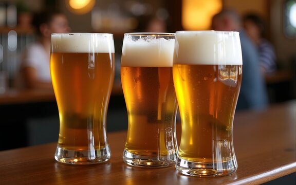 Group of people drinking beer at brewery pub restaurant - Happy friends enjoying happy hour sitting at bar table - Closeup image of brew glasses - Food and beverage lifestyle concept. High quality