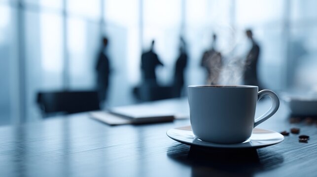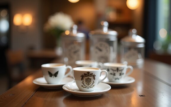 Elegant coffee service area featuring espresso cups at a business event with blurred background. High quality