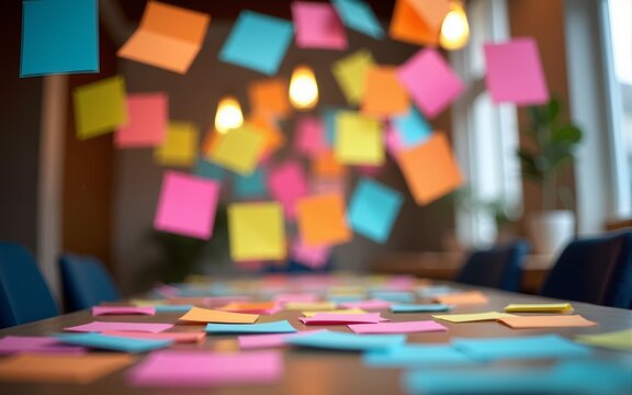 Colorful sticky notes floating in creative workspace, symbolizing brainstorming and idea generation. vibrant colors and blurred lights create inspiring atmosphere. High quality