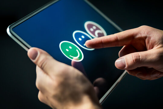 Customer holding virtual evaluation indicator rating since low to high for client excellent evaluate satisfaction after use product and service  concept.