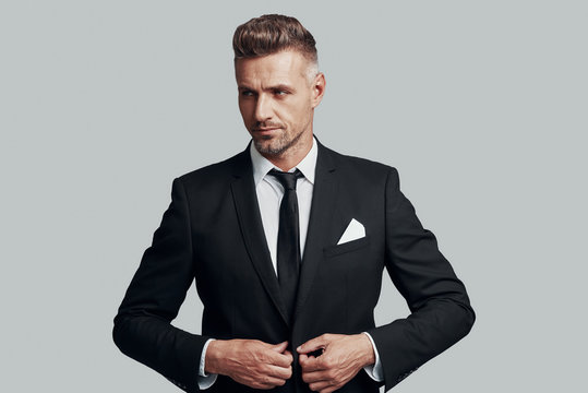 Young and successful. Handsome young man adjusting jacket and smiling while standing against grey background
