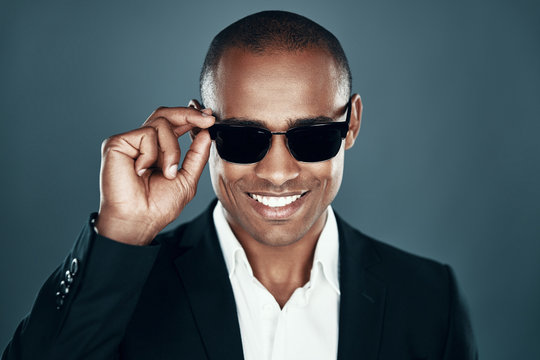 Everything must be perfect. Charming young African man in full suit looking at camera and adjusting eyewear while standing against grey background
