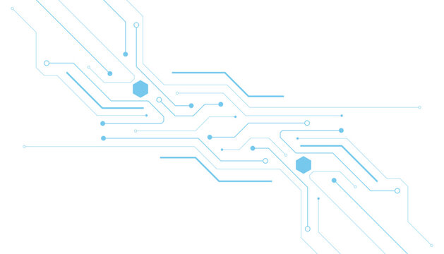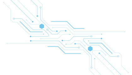 Circuit board components on a technology blue background. Horizontal web banner with empty place for text. AI chip on a futuristic chipset motherboard. Tech bg. Abstract digital vector illustration.