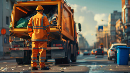 Dockworker wearing high visibility vest directing truck traffic in a busy container port, ensuring smooth operations and logistics