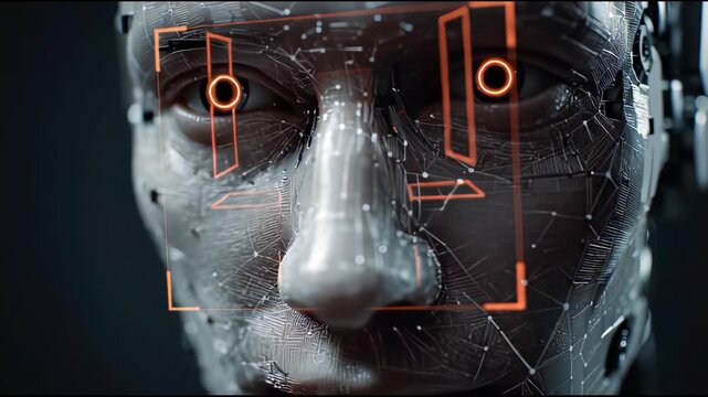 Close up of a futuristic robotic face with glowing orange facial recognition squares highlighting the eyes and intricate circuitry details