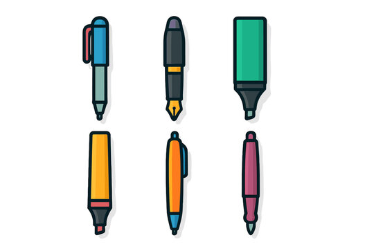 Assortment of colorful writing tools including fountain pens, ballpoint pens, and highlighters