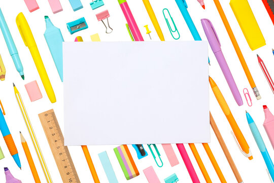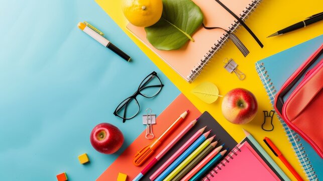 Assortment of colorful school stationery supplies for bright and creative classrooms, background