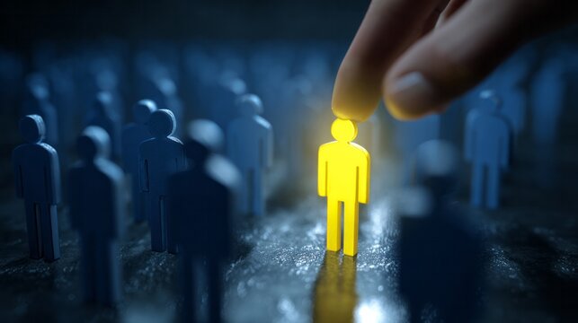 Hand selecting a unique yellow human figure from a crowd of blue figures, highlighting individuality and talent recruitment