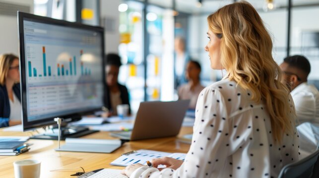 A focused businesswoman reviewing data on a large screen in a modern office, highlighting the importance of analytics in a collaborative professional setting.