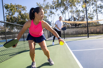 Co-ed pickleball players in a competitive match on an outdoor court. The fun game is highly popular in the United States and beyond.