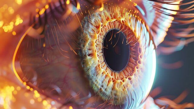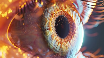 highly detailed close-up of a human eye, focusing on the intricate patterns and mechanism of vision from cornea to retina