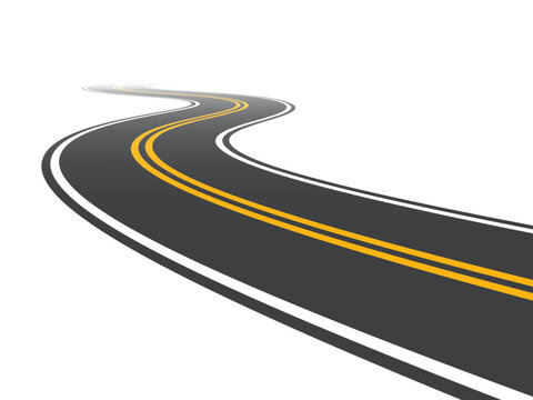 Winding road isolated on transparent background, curved road with white lines, bending traffic road to horizon in perspective, winding empty asphalt highway - stock vector