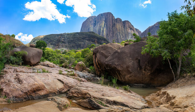 Andringitra national park, Haute Matsiatra region, Madagascar, beautiful mountain landscape with river in valley. Hiking in Andringitra mountains. Sunny day. Madagascar wilderness mountain landscape.