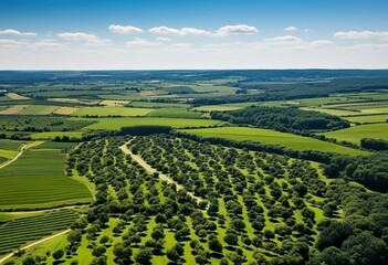 Aerial panorama of hilly countryside with cropland