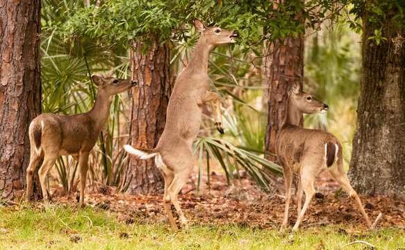Red deer hind eating grass with her fawn. Deer doe with her cub grazing on a meadow filed in autumn season.