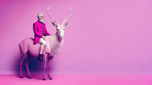 White beard urban hipster man in trendy pink suit with pink reindeer on pastel purple background. Fashionably, elegant minimal illustration. Generative AI.